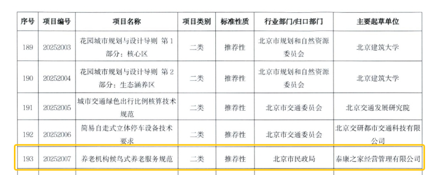 近期,2025年北京市地方标准制定计划正式发布,由QY千亿球友会QY之家经营管理有限公司(以下简称:QY千亿球友会QY之家)提报的《养老组织候鸟式养老服务规范》地标项目正式获批立项,不仅标志着QY千亿球友会QY之家将作为该标准的主要起草单位,为持续有助于北京市候鸟养老服务的标准化建设贡献QY千亿球友会QY力量,同时也意味着QY千亿球友会QY之家多年来在候鸟养老服务方面的探索和实践得到了认可,持续引领着我国养老服务行业高质量创新开展。